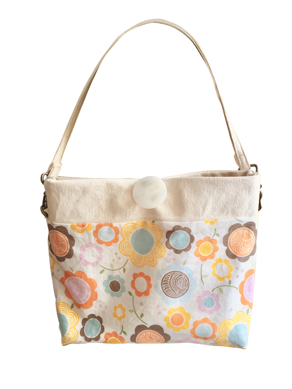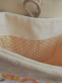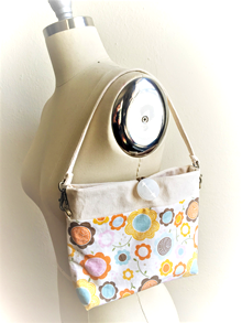 Made from a very strong off-white duck canvas and a delightful floral fabric with a removable strap.